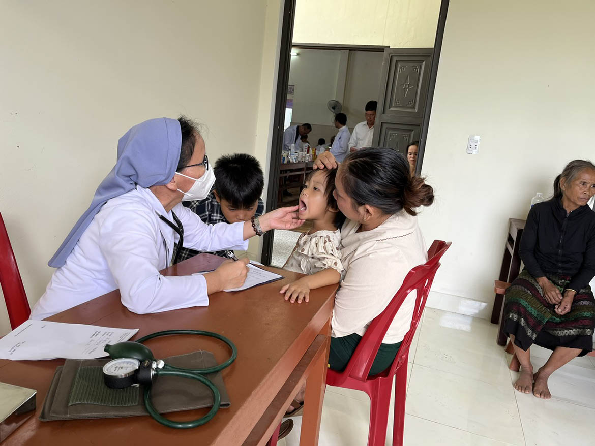 Quý Cha, quý Sơ và nhân viên đang trao thuốc cho bệnh nhân đã được khám
