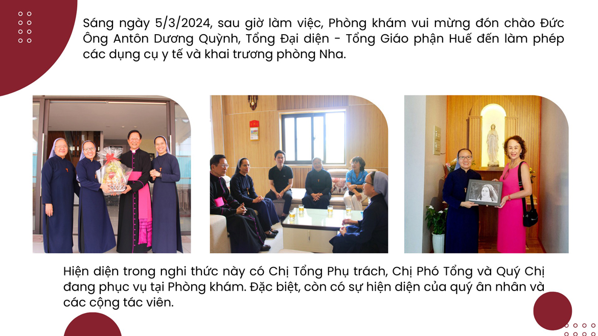 Sáng ngày 5/3/2024, Đức Ông Antôn Dương Quỳnh đã đến làm phép các dụng cụ y tế và khai trương phòng Nha tại Phòng khám Từ thiện Kim Long thuộc Hội dòng Con Đức Mẹ Vô Nhiễm.