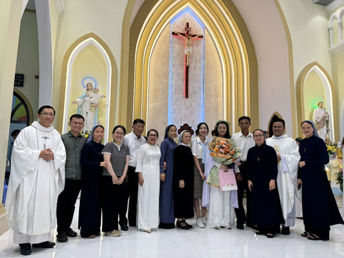 Chiều ngày 02/7/2024, một số đại điện nhóm thiện nguyện Phòng Khám Kim Long – F0 từ Huế vào hiệp thông trong Thánh lễ Tạ ơn ngày Đan nhận các Bí tích Khai tâm tại Nhà thờ Giáo xứ Ngọc Quang – Giáo phận Đà Nẵng. Thánh lễ do Đức TGM Phó Giuse Đặng Đức Ngân chủ tế và chủ sự các nghi thức. Thật cảm động khi nhìn thấy cô bé Nguyên Đan, với khuôn mặt tươi vui thánh thiện, nghiêng mình cúi nhận dòng nước Thanh Tẩy. Niềm vui và hạnh phúc thể hiện rõ trên nụ cười ngây thơ của Đan.
