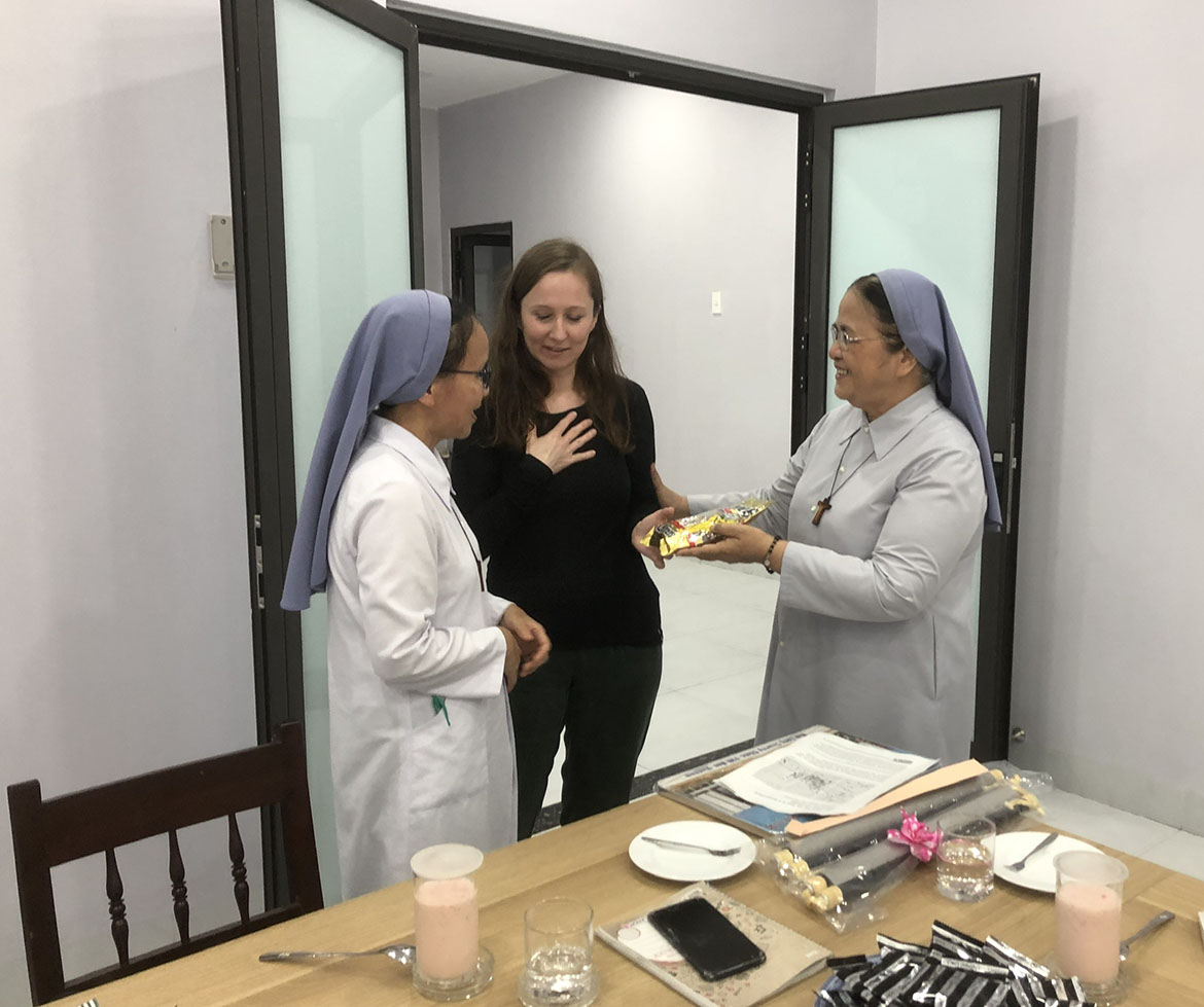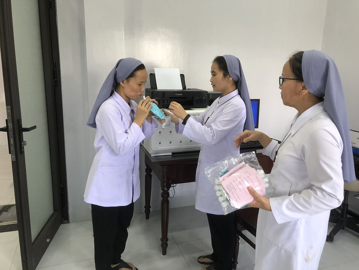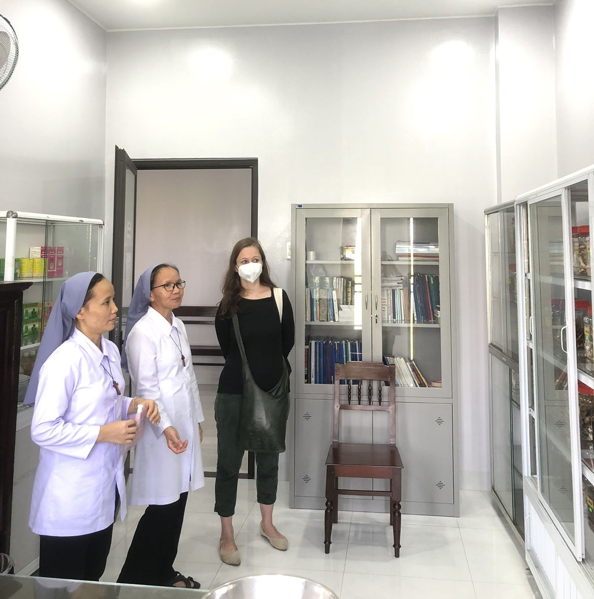Đón tiếp cô Gabriel có chị Phó Tổng Phụ trách M. Agata Bùi Thị Mến và chị Tổng Cố Vấn M. Anna Trần Thị Đức – Đại diện Hội Dòng cùng với quý chị em đang làm việc tại Phòng khám Từ thiện Kim Long.