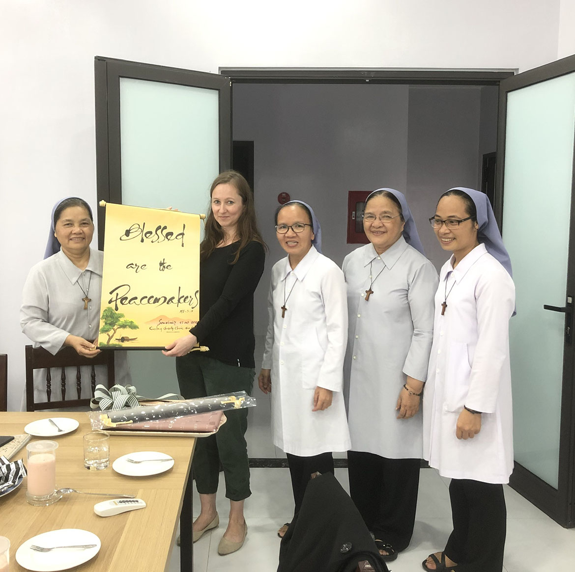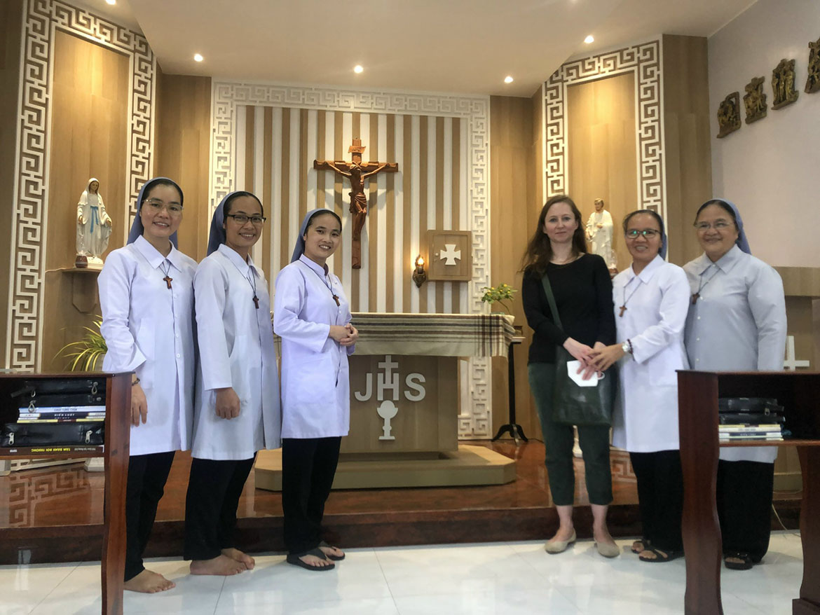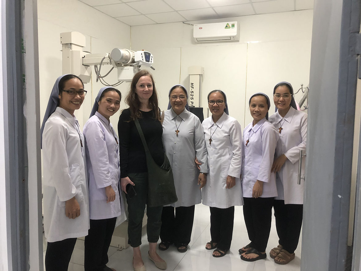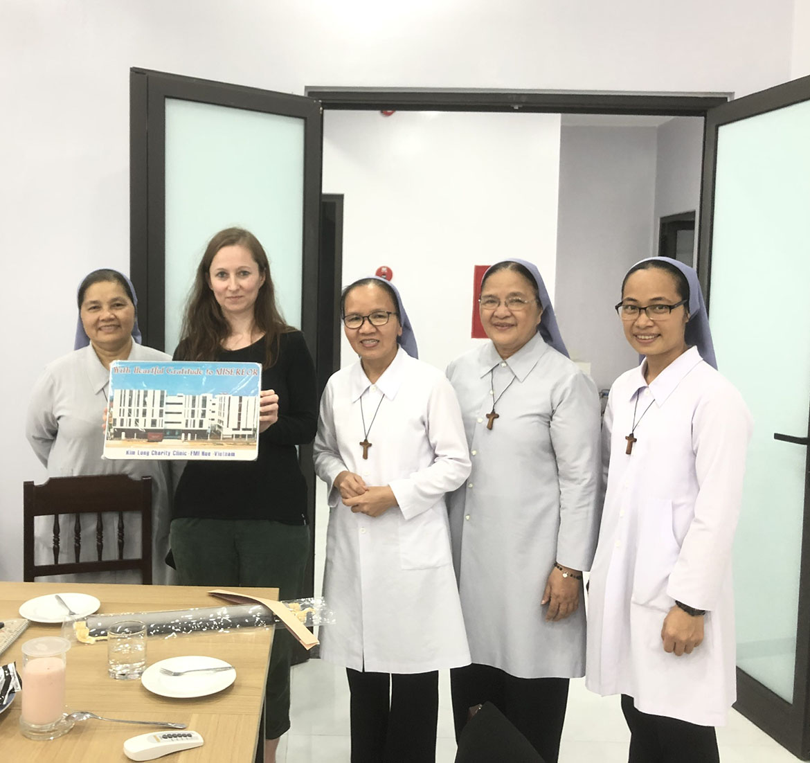 Đón tiếp cô Gabriel có chị Phó Tổng Phụ trách M. Agata Bùi Thị Mến và chị Tổng Cố Vấn M. Anna Trần Thị Đức – Đại diện Hội Dòng cùng với quý chị em đang làm việc tại Phòng khám Từ thiện Kim Long.