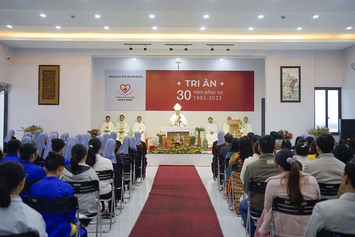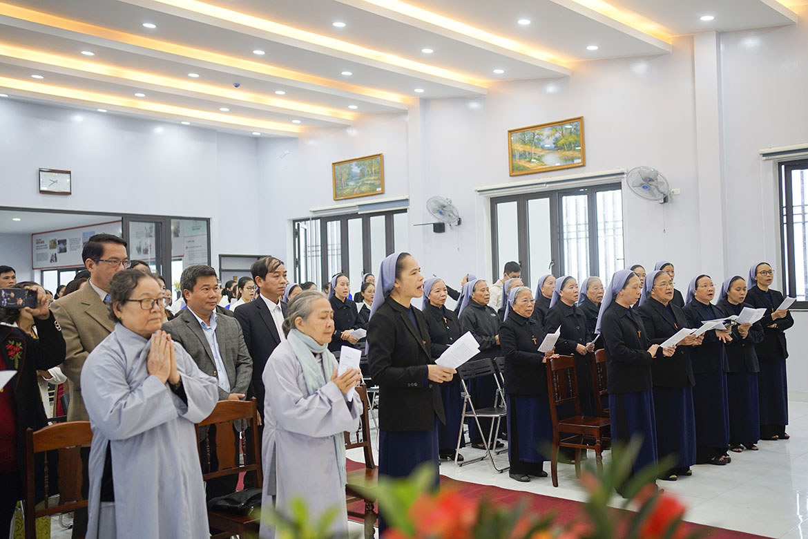Hôm nay, Phòng khám mang một nét đẹp mới, được trang trí lộng lẫy với những cánh hoa tươi, những lẵng hoa chúc mừng. Mọi người gặp nhau trong niềm vui, tiếng cười nói rôm rả. Đúng 9g30 một thánh lễ được Đức Tổng giám Mục Giuse Nguyễn Chí Linh cử hành cùng với cha Tổng Đại diện và Quý cha đồng tế. Thánh lễ là điểm quy tụ nơi mọi người tín hữu hiệp nhau trong niềm tin, dâng lời tạ ơn Thiên Chúa. Thánh lễ hôm nay rất đặc biệt vì không chỉ có linh mục tu sĩ, giáo dân mà còn quy tụ các sư thầy, ni cô của Phật giáo, các anh chị em không cùng tôn giáo cùng hiện diện chung lời ca tạ ơn.