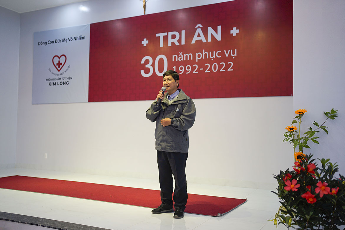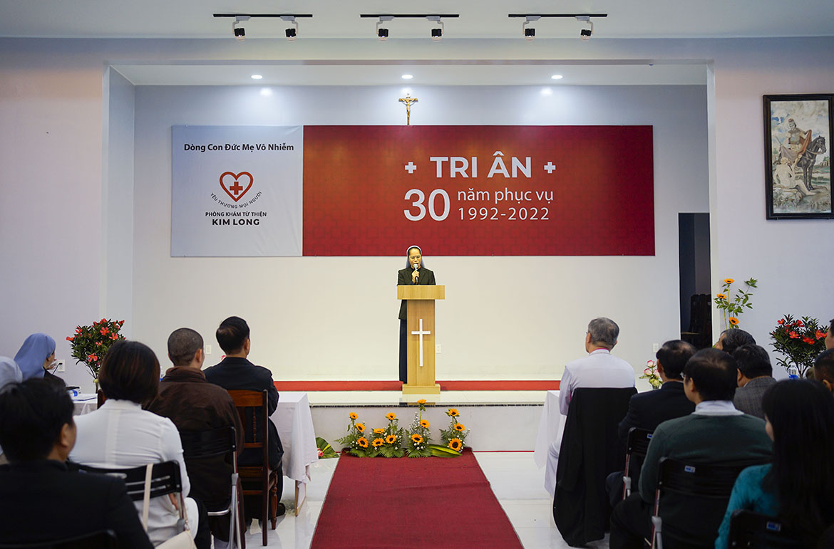 Cám ơn chính quyền các cấp tỉnh Thừa Thiên, Thành phố Huế, phường Kim Long, Sở Y tế, cách riêng Ông Phan Ngọc Thọ, nguyên Chủ tịch UBND Tỉnh Thừa Thiên Huế, Phó Bí thư Thường trực Tỉnh ủy, trong suốt 30 năm đã tạo mọi điều kiện thuận tiện cho công việc của Phòng khám. Cám ơn Đại đức Thích Tâm Quang - GĐ Trung tâm Hỗ trợ Cộng đồng Hải Đức, Quý Ni sư và thiện nguyện viên, đại diện Nhóm Hướng Thiện - Tp Huế đã cùng chung tay với chúng tôi, trong việc chăm sóc, thăm viếng các bệnh nhân HIV, người nghèo trong các cuộc lũ lụt...cùng nhau xoa dịu nỗi đau của anh chị em bất hạnh. Cám ơn Hội bác Ái Misereor Đức, ngay từ khi phòng khám hiện diện đã hỗ trợ thuốc men, dụng cụ y tế, và đặc biệt đã giúp đỡ phần lớn kinh phí cho việc xây phòng khám mới nầy. Lời cám ơn chân thành nhất xin trao gởi đến các Bác sĩ, y tá, các thiện nguyện viên. 30 năm phòng khám có mặt là 30 năm có sự hiện diện quý báu của quý vị. Quý anh chị là những cộng tác viên đắc lực là cánh tay nối dài yêu thương và phục vụ của chị em chúng tôi. Xin gởi đến quý thân nhân, ân nhân lòng biết ơn sâu sắc. Những đồng tiền góp nhặt, những lời động viên thăm hỏi là sự nâng đỡ cho chị em chúng tôi. Lời cám ơn không thể thiếu và dạt dào yêu thương trong lúc nầy chúng tôi xin gởi đến các anh chị em bệnh nhân. Cám ơn sự tín nhiệm của anh chị, sự đơn sơ khó nghèo của anh chị là bài học và là tấm gương cho chúng tôi. Cuối cùng lời cám ơn chúng em hướng đến các chị em đã và đang phục vụ, đặc biệt xin gởi đến chị Nguyên Tổng phụ trách M. Phạm Thị Bích Thủy, người đã lo lắng ngược xuôi để xin đất, xin hổ trợ cho phòng khám mọc lên. Xin cám ơn hai chị bác sĩ thân yêu chị M. Consolata Bùi Thị Bông, chị M. Benedictine Nguyễn Thị Điền đã khai sinh phòng khám trong sự nghèo khó, phó thác.