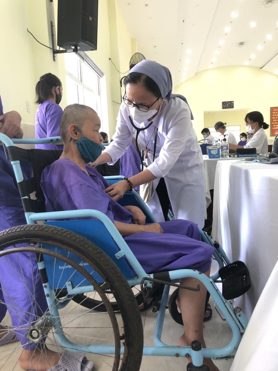 Thế nhưng khi bước chân vào Trung tâm, khi đến Hội trường của Trung tâm – nơi được bố trí để thực hiện việc thăm khám, đoàn khám bệnh thật sự cảm thấy yên tâm bởi sự chuẩn bị khang trang và chu đáo của những nhân viên đang phục vụ tại đây. Được sự đồng hành, hướng dẫn của các nhân viên, các bệnh nhân rất trật tự, nghiêm túc và sẵn sàng hợp tác với các Bác sĩ thăm khám.