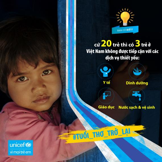 Cứ 20 trẻ em ở Việt Nam thì có 3 trẻ em không được tiếp cận với các dịch vụ thiết yếu như giáo dục, y tế, dinh dưỡng, nơi ở, nước sạch và vệ sinh, và hòa nhập xã hội.