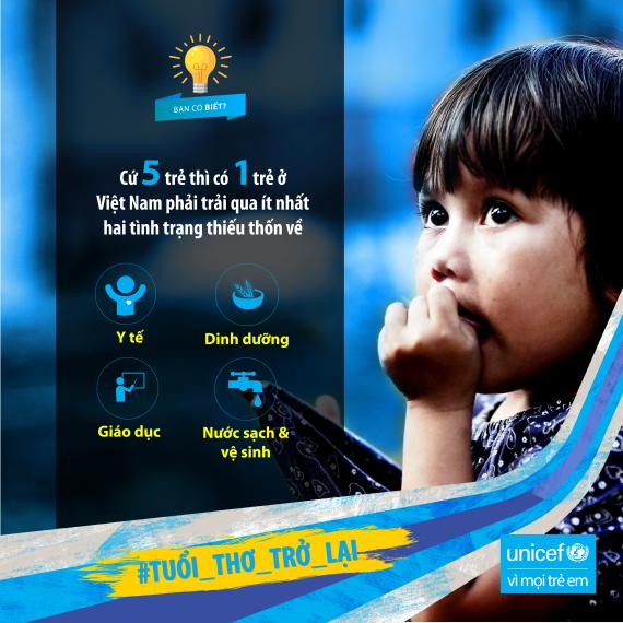 Cứ 5 trẻ em ở Việt Nam thì có 1 trẻ (ước tính khoảng 5,5 triệu trẻ em) phải trải qua ít nhất hai tình trạng thiếu thốn về giáo dục, sức khỏe, dinh dưỡng, nơi ở, nước sạch và vệ sinh, hoặc hòa nhập xã hội.