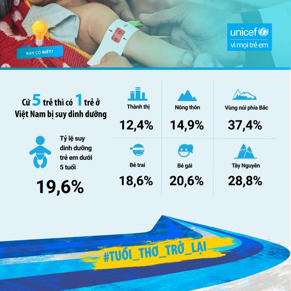 Cứ 5 trẻ thì có 1 trẻ ở Việt Nam bị suy dinh dưỡng. Tỷ lệ suy dinh dưỡng thể thấp còi cao nhất ở miền núi phía Bắc, cứ 3 trẻ thì có 1 trẻ bị suy dinh dưỡng thể thấp còi.
