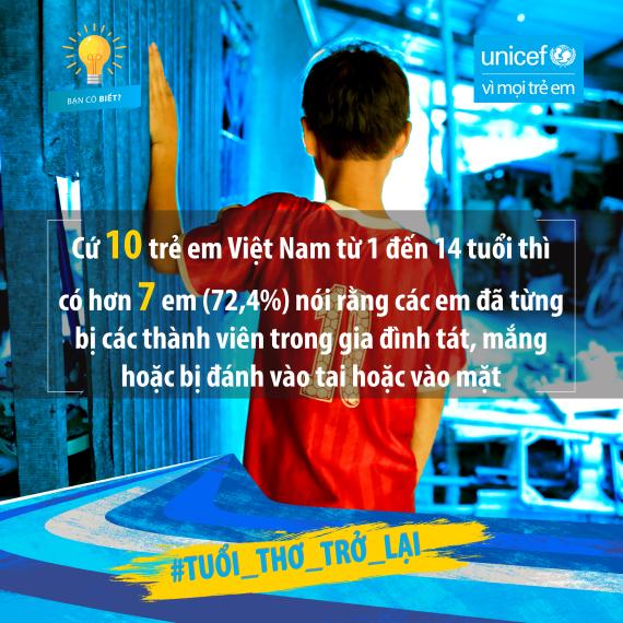 Cứ 10 trẻ em Việt Nam từ 1 đến 14 tuổi thì có hơn 7 em (72,4%) nói rằng các em đã từng bị các thành viên trong gia đình tát, mắng hoặc bị đánh vào tai hoặc vào mặt.