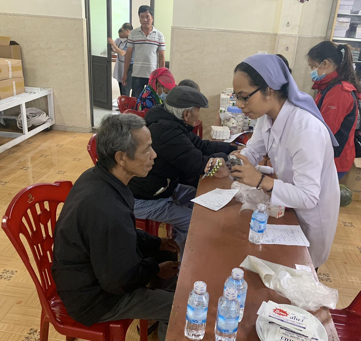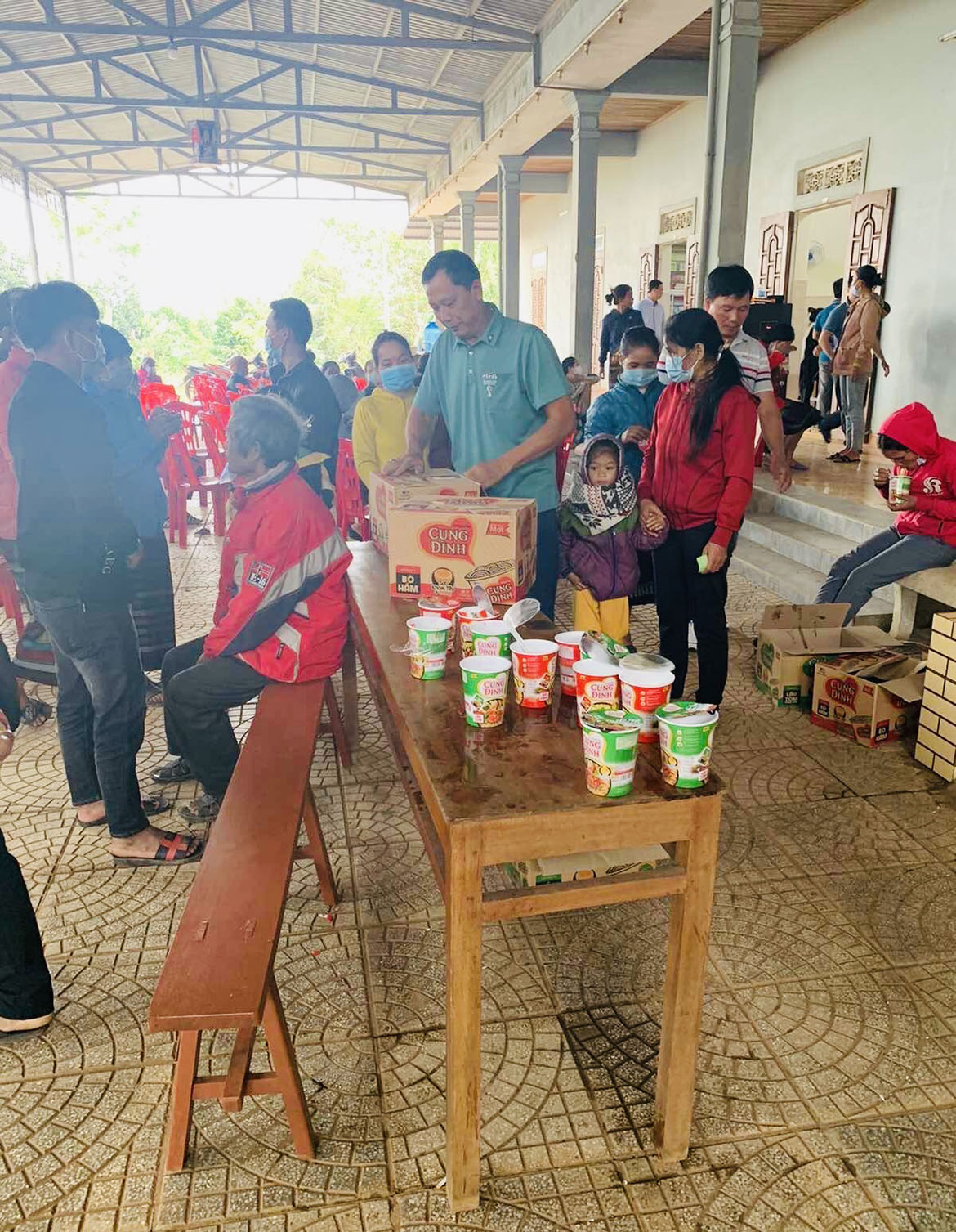 Trước lúc đoàn khám nghỉ trưa, Cha Quản xứ Khe Sanh đã lấy hết số mì tôm trong nhà gồm 9 thùng, phân phát mỗi người lớn nhỏ một ly mì gói. Họ dùng trưa tại chỗ, chờ gọi tên được khám ca chiều. Lời nhắn nhủ của Thầy Giê-su “chính anh em hãy cho họ ăn” luôn được những mục tử của Chúa đáp lại. Đặc biệt khi họ đang cạnh kề những con người bé nhỏ.